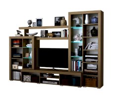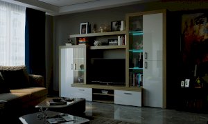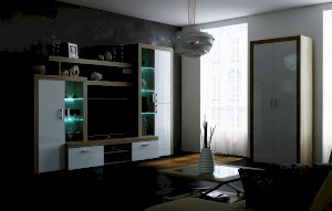 Гостиная «Орландо» опционально может комплектоваться светодиодной подсветкой стеклополок витрин. Фасадная часть гостиной подчёркнута стильными планками МДФ, представляющими собой элементы корпуса и фасада.