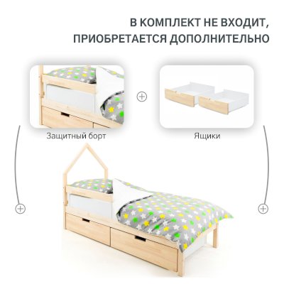 Комплект кровати состоит из каркаса кровати и ортопедического основания. Бортик, ящики, матрас и постельные принадлежности приобретаются отдельно.
