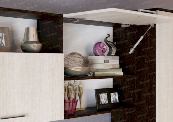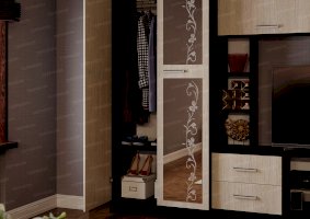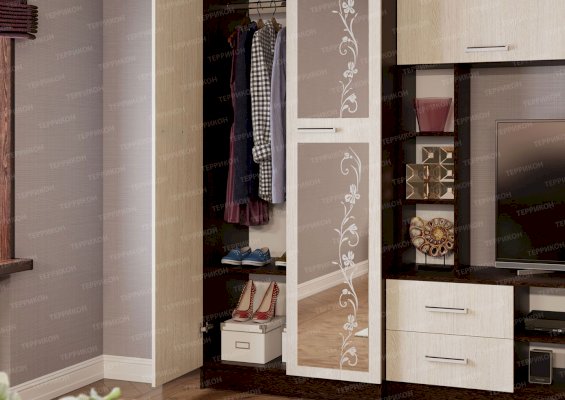 Универсальный дизайн и высокую функциональность объединила в себе гостиная «Флора». Она надежна и вместительна, рассчитана на долгие годы активной эксплуатации. Незамысловатое оформление гарнитура идеально гармонирует с современными интерьерами. Индивидуальность и немного шарма придают изделию цветочный орнамент на зеркале и ассиметрично расположенные открытые полочки.