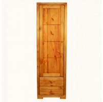 Этот однодверный шкаф имеет четыре полки за дверью. В нижней части витрины расположены два ящика с плавным механизмом выдвижения. Эта простая и удобная конструкция в силу своей лаконичности будет всегда популярна и актуальна. Массив сосны, из которого изготовлена витрина, позволит мебели сохранить свои высокие эксплуатационные свойства и безупречный внешний вид на протяжении многих лет.
