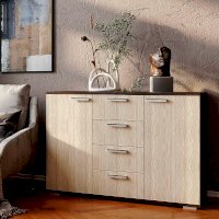 Комод Стандарт №2 – прекрасный выбор для спальни или гостиной! Данная модель состоит из четырех центральных выдвижных ящиков, а также двух боковых секций с распашными дверцами. Комод позволит вместить большое количество вещей, одежды и любых мелочей.