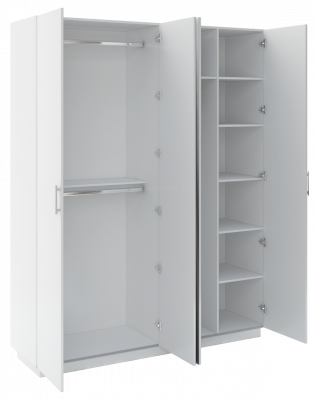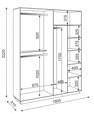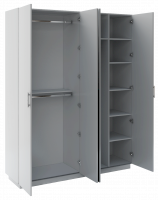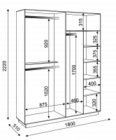 • В правой - две мини секции: с вешалом для длинных вещей и с 4 полками (две нижние и верхняя полки - съемные; третья снизу - жесткая), эти мини секции объединены общей верхней жесткой полкой.