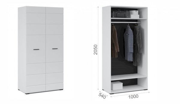 Компактный шкаф Йорк – это решение для небольшой спальни, гостиной или прихожей. Он выполнен в современном стиле – сочетает в себе функциональность и эффектный внешний вид: горизонтальная фрезеровка фасадов, контрастные черного цвета ручки и задняя стенка из ХДФ. Глянцевые белые фасады High Gloss из МДФ наполняют помещение светом, делают его воздушнее. Внутри предусмотрены секции для белья и отделение со штангой. Идеально компонуется со всеми модулями системы Йорк.