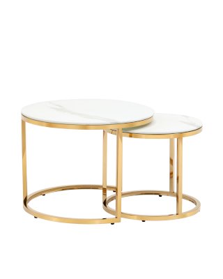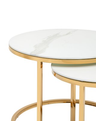 Два журнальных столика с круглой столешницей под мрамор разного размера в наборе. Столешница выполнена из закаленного стекла. Каркас изготовлен из нержавеющей стали с гальваническим покрытием с применением нитрида титана. Такое покрытие обладает рядом преимуществ: