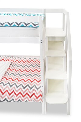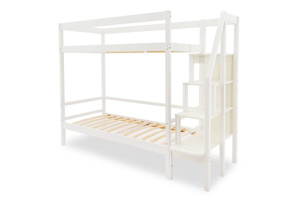 Кровать оборудована практичной лестницей-стеллажом. Полки лестницы можно использовать для игрушек, книг, ночника. Лестницу легко зафиксировать как справа, так и слева от кровати, что очень удобно. На каждом ярусе установлено прочное ортопедическое основание из 12 лат. Спальное место выдерживает нагрузку до 200 кг.