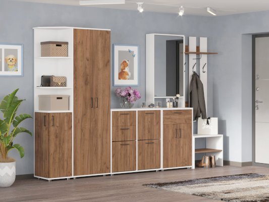 Тумба для прихожей имеет  2 отделения под обувь оснащенными обувными механизмами, два выдвижных ящика и нишу за закрытой дверкой для обуви или различных вещей.
