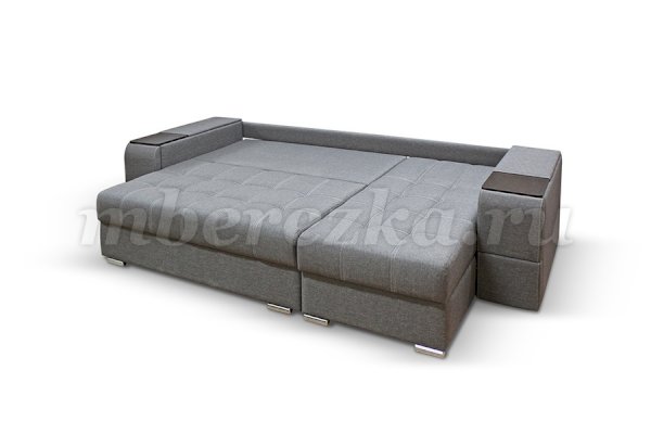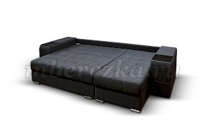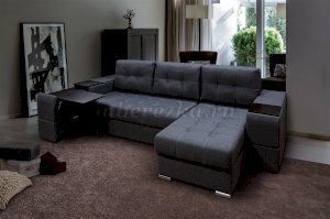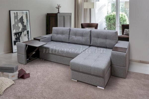 Угловой диван со столиком и выдвижными ящиками в подлокотниках «РИФ» завоевал среди покупателей большую популярность. Такая мебель значительно экономит пространство в помещении и, несомненно, делает отдых на диване комфортнее, ведь буквально под рукой есть раскладной столик в подлокотнике, на который можно поставить бокал, положить книгу или журнал, удобен при работе с ноутбуком. Другой подлокотник оборудован выдвижными полочками для хранения различных вещей. Большой ящик для белья внутри дивана, простой, и надежный механизм трансформации «тик-так» подтверждают функциональность этой модели. Блок независимых пружин, прошивка на сиденье – гарантия длительной эксплуатации дивана.