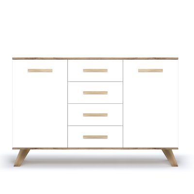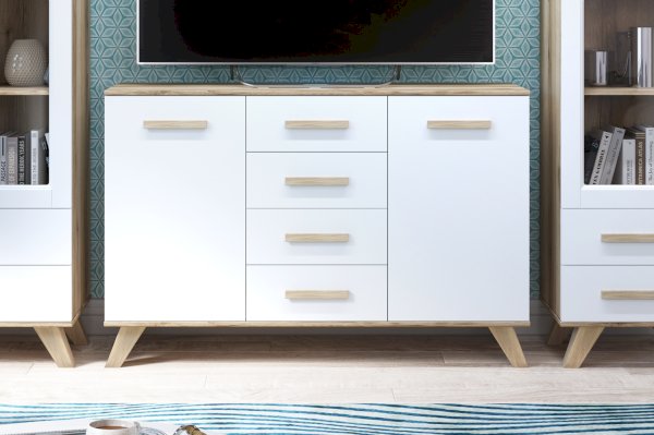 Комодино серии «Вега Скандинавия» — это стильный большой комод для спальни или гостиной. Вы можете установить на него телевизор или украсить статуэтками, вазами или рамочками с любимыми фото. Удобство хранения в закрытом виде обеспечивают 4 выдвижных ящика, а также большие отделы с распашными дверцами.