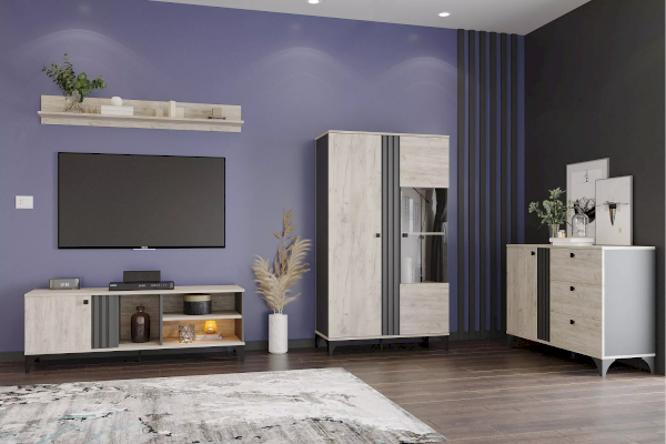 Тумба оснащена тремя открытыми нишами, в которых можно расположить аудио- и видеоаппаратуру, а также полкой за распашной дверкой с системой доводчиков, благодаря которым дверка закрывается плавно и бесшумно, а высокие опоры обеспечивают быстрый и легкий доступ во время уборки.