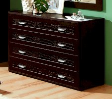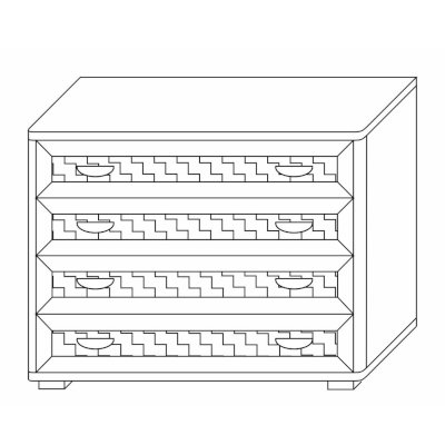 Комод имеет 4 широких (ширина изделия 1050 мм) ящика с декоративными вставками по центру фасадов, которые устанавливаются на телескопические шариковые направляющие полного выдвижения.