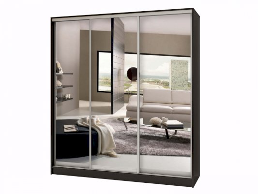 Данное изображение представлено в следующих цветах: корпус - Венге Цаво, фасады - зеркало, рамка двери и треки - Серебро матовое.