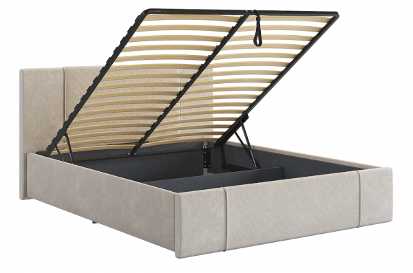 Доступны три цветовых варианта - галька, крем и латте. Чехол на бортах и изножье кровати съемный, что обеспечивает легкость ухода и возможность экспериментировать с цветовыми решениями.