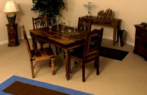 Изысканный обеденный стол из коллекции BOMBAY, выполненный из массива палисандра, способен стать не просто частью комнаты, но и задать тон вашему интерьеру. Элегантные резные ножки ручной работы и винтажная фурнитура из черного металла привносят в дизайн живости и служат ярким акцентом изделия. Размеры стола позволяют с удобством разместить от четырех до шести человек. Деревянная столешница из массива палисандра, обработанная прозрачным лаком, зачаровывает благородством рисунка, изысканностью материала и красотой. Модель долговечна, прочна, надежна и не требует специального ухода. Стол отлично гармонирует с мебелью из коллекции BOMBAY, поставляется в разобранном виде.