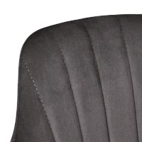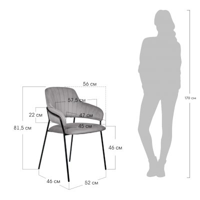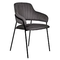 Каркас стула черного цвета изготовлен из прочного металла. Сидение обтянуто мебельным велюром, с приятной бархатистой структурой. Внутренняя сторона спинки украшена вертикальными строчками. Для комфорта есть высокие подлокотники.