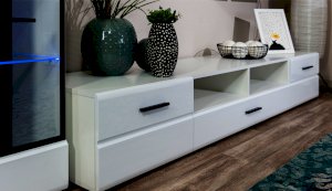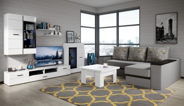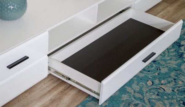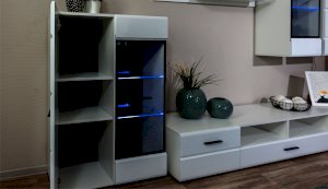 Модульная система Йорк выполнена в стиле минимализма. Строгие, лаконичные линии подчеркивают элегантность комплекта. Белый цвет мебели с деталями глубокого черного визуально сделает комнату светлее, просторнее и позволит составить безупречный по стилю комплект мебели. Сочетание глянцевой и стеклянной поверхностей, открытых полок создадут уютную обстановку и позволят украсить убранство комнаты приятными мелочами и разместить любимые книги и фото. Светодиодная подсветка придаст индивидуальность Вашей мебели. А широкая тумба для ТВ с выдвижными ящиками на телескопических направляющих позволит удобно разместить телевизор любой диагонали и другие медиаустройства Модульная система позволит подобрать по размеру вариант именно для Вашей комнаты, не оглядываясь на фиксированный размер, как в других стенках. Мебель выполнена из экологически безопасных материалов.
