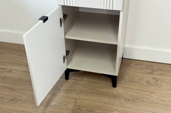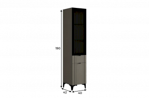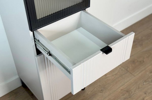 Шкаф оснащён надёжной металлической ручкой и имеет удобное внутреннее наполнение: надёжные полки за стеклянной и глухой дверцами, а также выкатной ящик. Это позволяет рационально использовать пространство.
