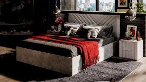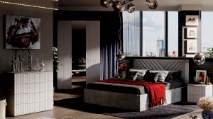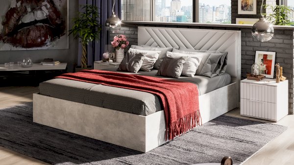 Декор. Мебель для спальни непременно должна быть изготовлена из надёжных материалов, именно такой и является наша новинка. Каркас выполнен из ЛДСП с имитацией бетонной поверхности «Ателье светлый», а фасады МДФ облицованы пленкой ПВХ «Белый матовый» и декорированы вертикальной фрезеровкой. Визуальный объем и глубину рисунка «Ателье» подчеркивает суперматовая структура, которая отлично сочетается с однотонными декорами, а белый цвет в интерьере является наиболее популярным, ведь он расширяет пространство, добавляет воздуха и свежести.